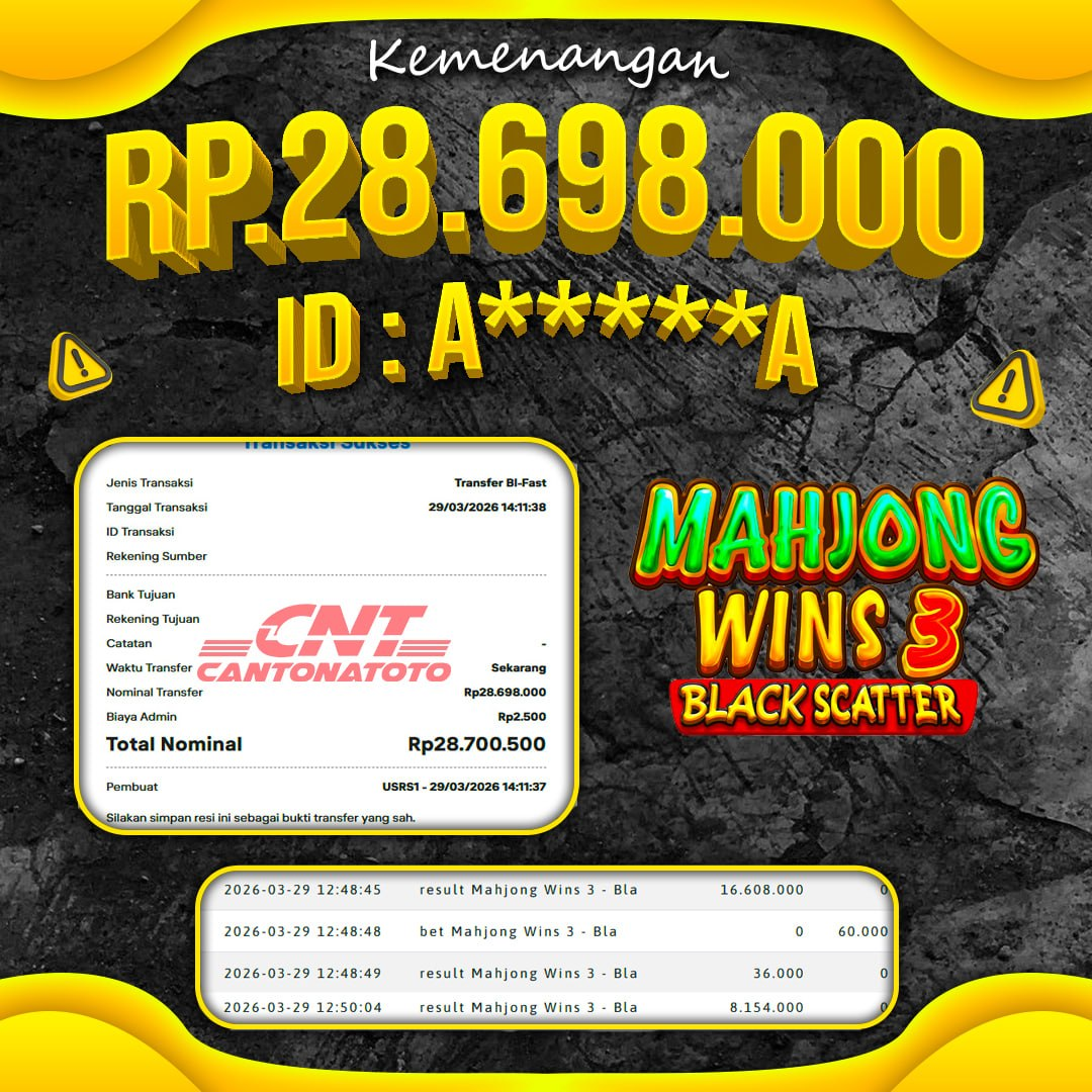 SELAMAT KEPADA MEMBER BERUNTUNG KAMI HARI INI ???? KEMENANGAN BESAR KEMBALI TERJADI DAN BERHASIL DIBAWA PULANG OLEH SALAH SATU MEMBER SETIA KAMI. TERIMA KASIH SUDAH PERCAYA BERMAIN BERSAMA KAMI. SEMOGA KEMENANGAN INI MENJADI AWAL DARI KEMENANGAN BESAR BERIKUTNYA ???????? ❤️SEL4M4T KEPADA M3MB3R S3TIA CANTONATOTO ????TANGGAL : 29 MARET 2026 ????USER ID : A*****A ????B0 : CNTT ????M3N4NG : Mahjong Wins 3 - Bla ????RP. 28.700.000 ???????????????????????? : https://rebrand.ly/daftarcantona