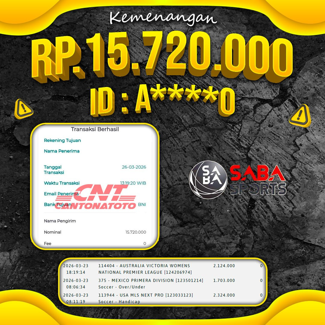 SELAMAT KEPADA MEMBER BERUNTUNG KAMI HARI INI ???? KEMENANGAN BESAR KEMBALI TERJADI DAN BERHASIL DIBAWA PULANG OLEH SALAH SATU MEMBER SETIA KAMI. TERIMA KASIH SUDAH PERCAYA BERMAIN BERSAMA KAMI. SEMOGA KEMENANGAN INI MENJADI AWAL DARI KEMENANGAN BESAR BERIKUTNYA ???????? ❤️SEL4M4T KEPADA M3MB3R S3TIA CANTONATOTO ????TANGGAL : 26 MARET 2026 ????USER ID : A****0 ????B0 : CNTT ????M3N4NG : SABA SPORTS ????RP. 15.720.000